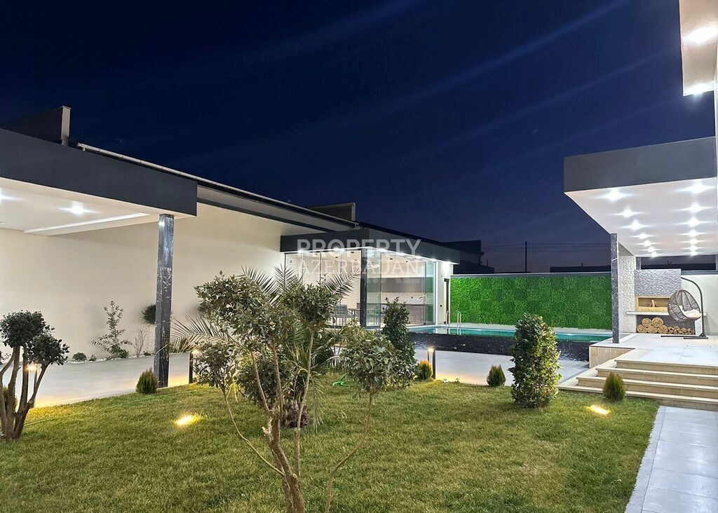 The outdoor area includes a landscaped garden with decorative trees, a swimming pool, gazebo, barbecue area, and a summer kitchen, creating a comfortable private living environment.