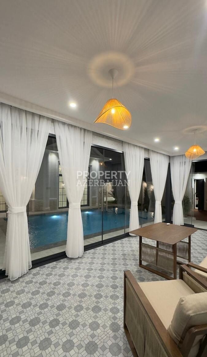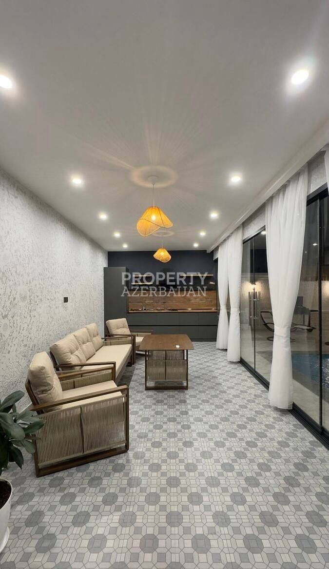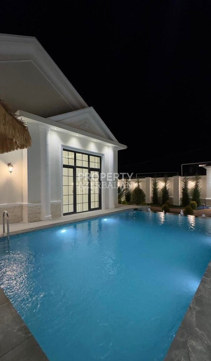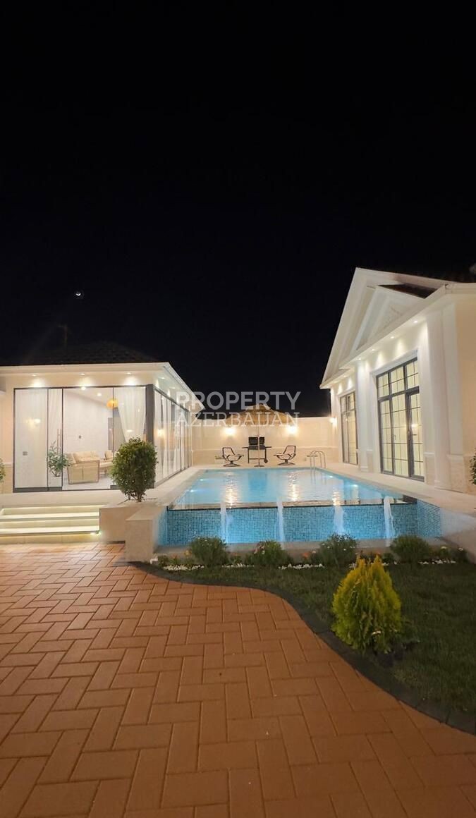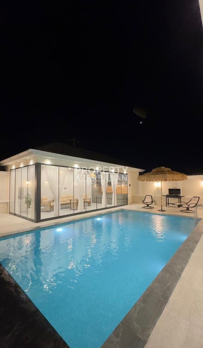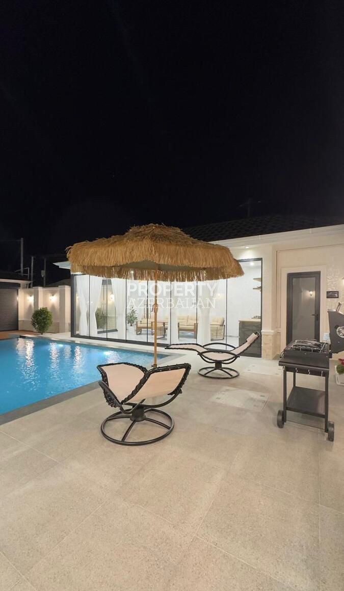 The outdoor area includes a landscaped yard with a swimming pool, gazebo, barbecue area, and summer kitchen, creating a comfortable lifestyle for both living and отдыха.